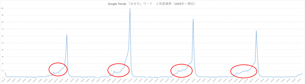図4:Google Trends「おせち」ワードの人気度推移(2019年1月~現在)