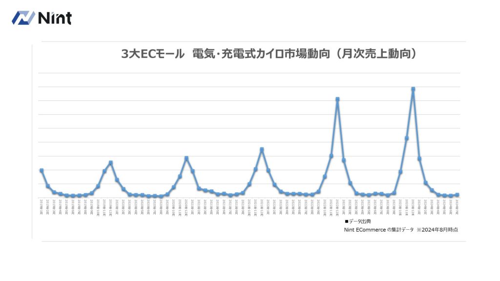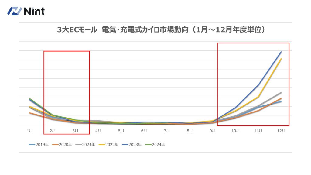 電気・充電式カイロの月次動向は非常に分かりやすく、売上規模は変化していますが、売上曲線には変化が見られません。売上のピークは各年12月です。12月のみ売上が高い理由として、電気・充電式カイロが年末セールなどで取り扱われることが多い季節商品の位置づけであることが大きく影響していると考えられます。