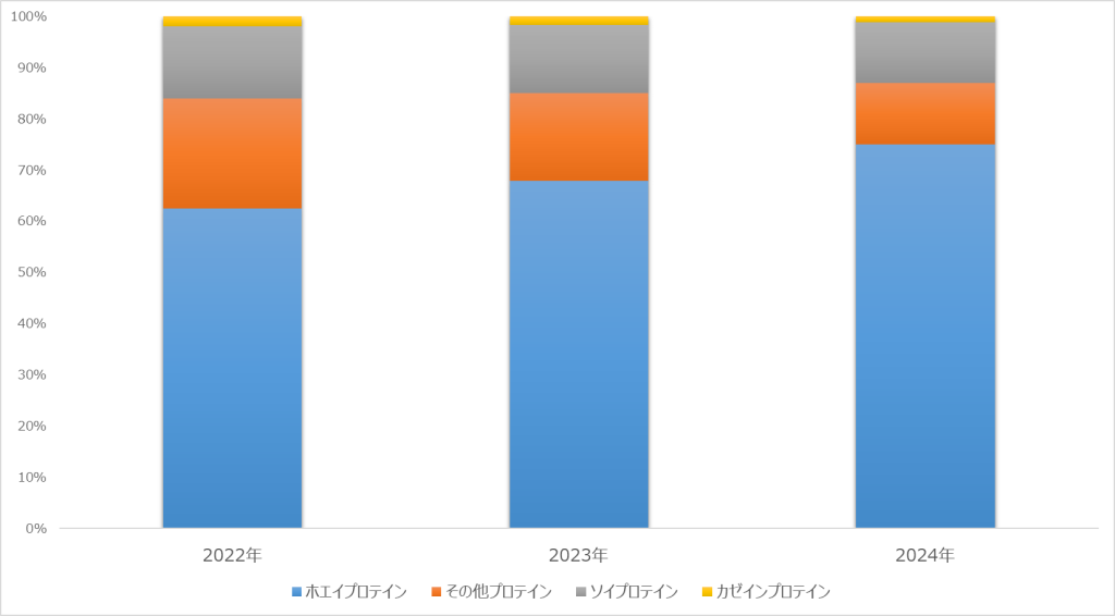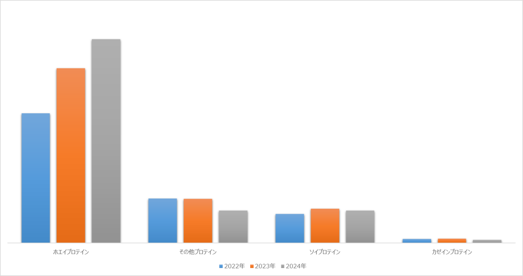 構成比推移から改めて2022年~2024年のトレンドを見ると、ホエイプロテインの売上構成比が上昇、その他プロテインの売上構成比が減少していることが、分かります。