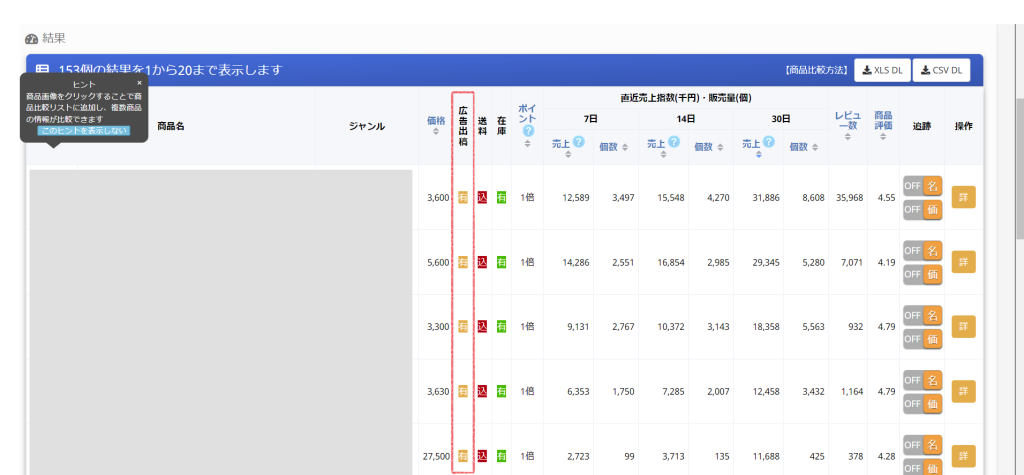 当社では楽天市場に出店中のショップ様、メーカー様向けにモールデータの提供を行っています。競合ショップではどのようなRPP広告を出稿しているのか、確認し分析することで効果的な広告出稿を行うことができます。どの商品で広告出稿を行っているのか、広告出稿を行っていない商品でどのくらいの売上があるのか確認することをおすすめしています。