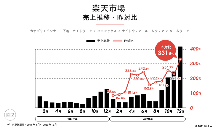 図1はファッションまたはインナー・下着・ナイトウェアカテゴリにおける「ルームウェア」関連商品の、3モール合計売上推移と昨対比を表したものです。