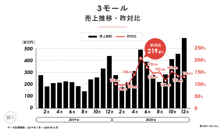 特に2020年9月から12月にかけて伸長が大きく見られ、2020年12月は昨対比300%を超える結果となりました。