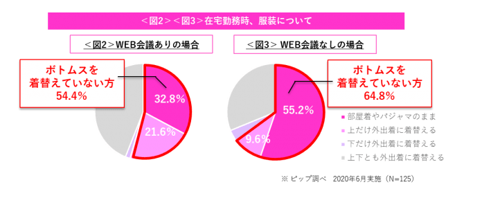 また、ピップ株式会社が2020年6月に行った調査(※4)では、オンライン会議がない場合、回答者の女性125人のうち半数以上がボトムスを着替えていない、という結果も出ています。
