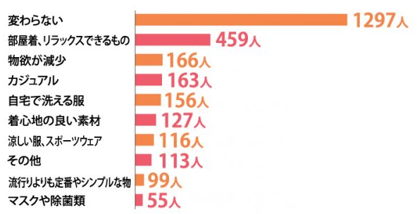 「新型コロナウイルスの影響で欲しい服やアイテムの系統はどのように変化したか」という質問に対し、殆どの人が変わらないと回答したものの、次いで多かったのは部屋着やリラックスできるもの、という回答でした。