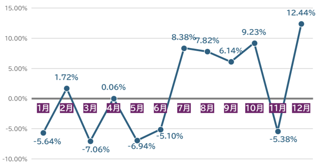 続いてNint ECommerceによる計算結果を月別に分解し、1年を通しての動きについて見てみましょう。次のグラフの通り、1月は-5.64%、3月は-7.06%、5月は-6.94%、6月は-5.10%といったように、年の前半は前年割れの月が4か月もありました。一方で年の後半は11月のみ前年割れとなっており、前半よりも好調であったことがわかります。つまり年間では1.25%と微増ですが、細かく見てみると、やや不調な前半に対し後半盛り返した年であったと見ることが出来ます。