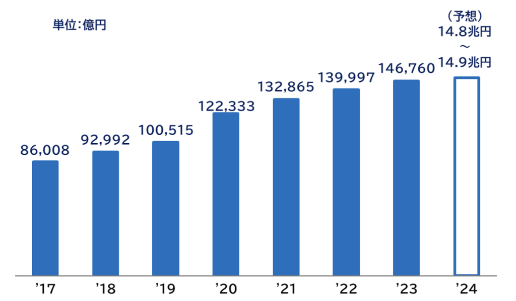 | 2024年のEC市場規模予測 14兆8,595億円 ~ 14兆8,961億円 |
