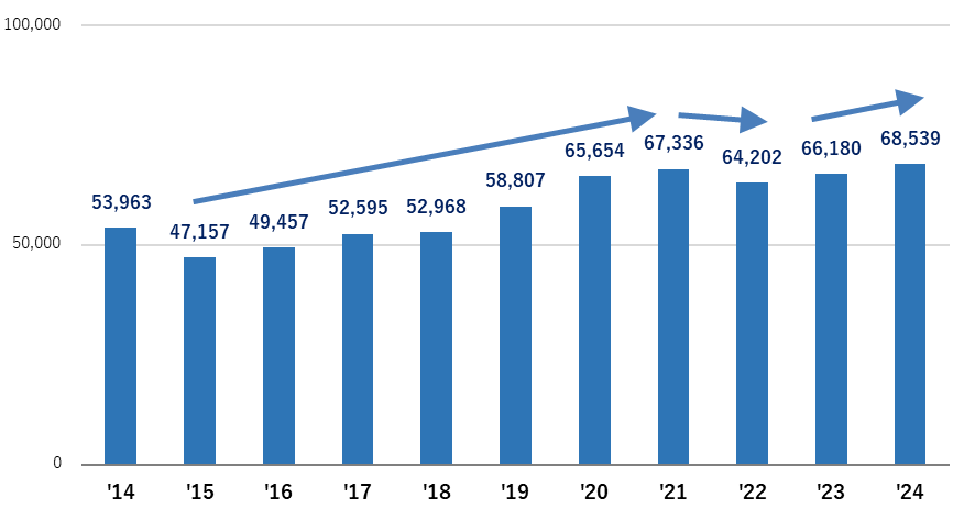 2015年は前年割れしたものの、2016年から2021年までは毎年支出額は増えています。特に2020年は前年比で大きく増えており、コロナ禍での特別給付金で家電が多く購入されたことを数値が物語っています。その後2022年は前年割れしていますが、これはその反動でしょう。2023年には再び増加に転じ、2024年も支出額はさらに増えています。