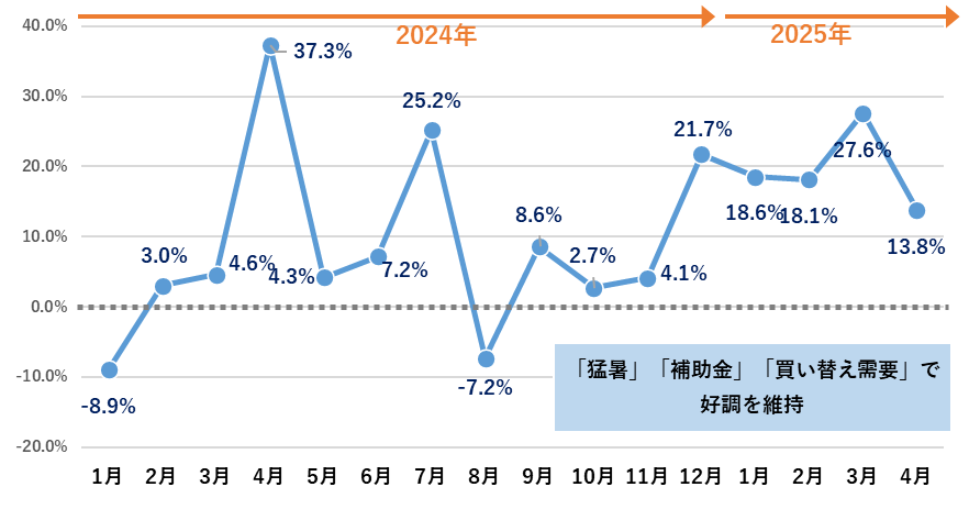 2025年も猛暑が予想されています。かつ政府や自治体による補助金の実施や、買い替え需要等ポジティブな要素も加わって、2025年もプラスに推移すると私は予想しています。