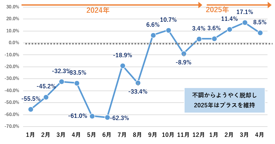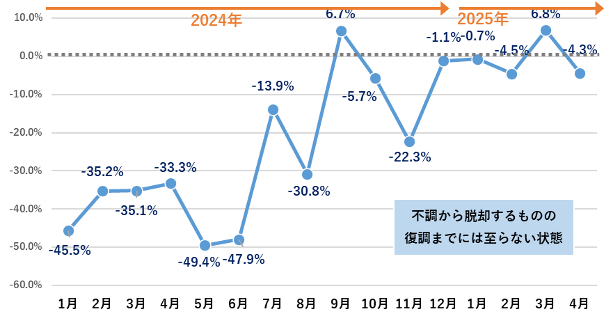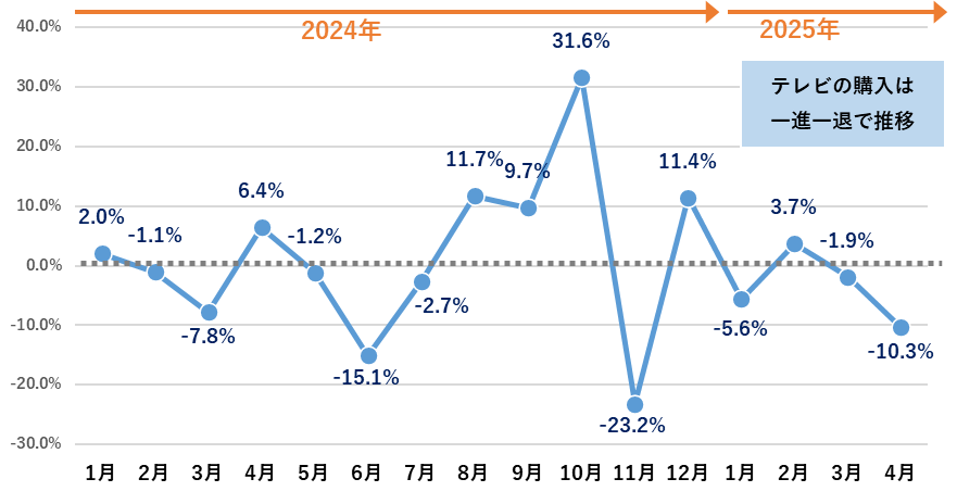 洗濯機に関しては、2024年は8月まで不調が続いていましたが、9月からはプラスに転じました(※11月を除く)。2025年に入ってもプラスを維持していますので、不調から脱却したように見えます。また冷蔵庫も洗濯機と似た動きをしており、2024年の8月までは不調が続いていましたが、こちらも復調の兆しが見られます。ただし9月以降の動きを見ると、洗濯機と比較し冷蔵庫はプラスとなった月は2024年9月と2025年3月のみです。両者は似たような動きをしていますが、冷蔵庫は完全に復調したとまでは言い切れません。