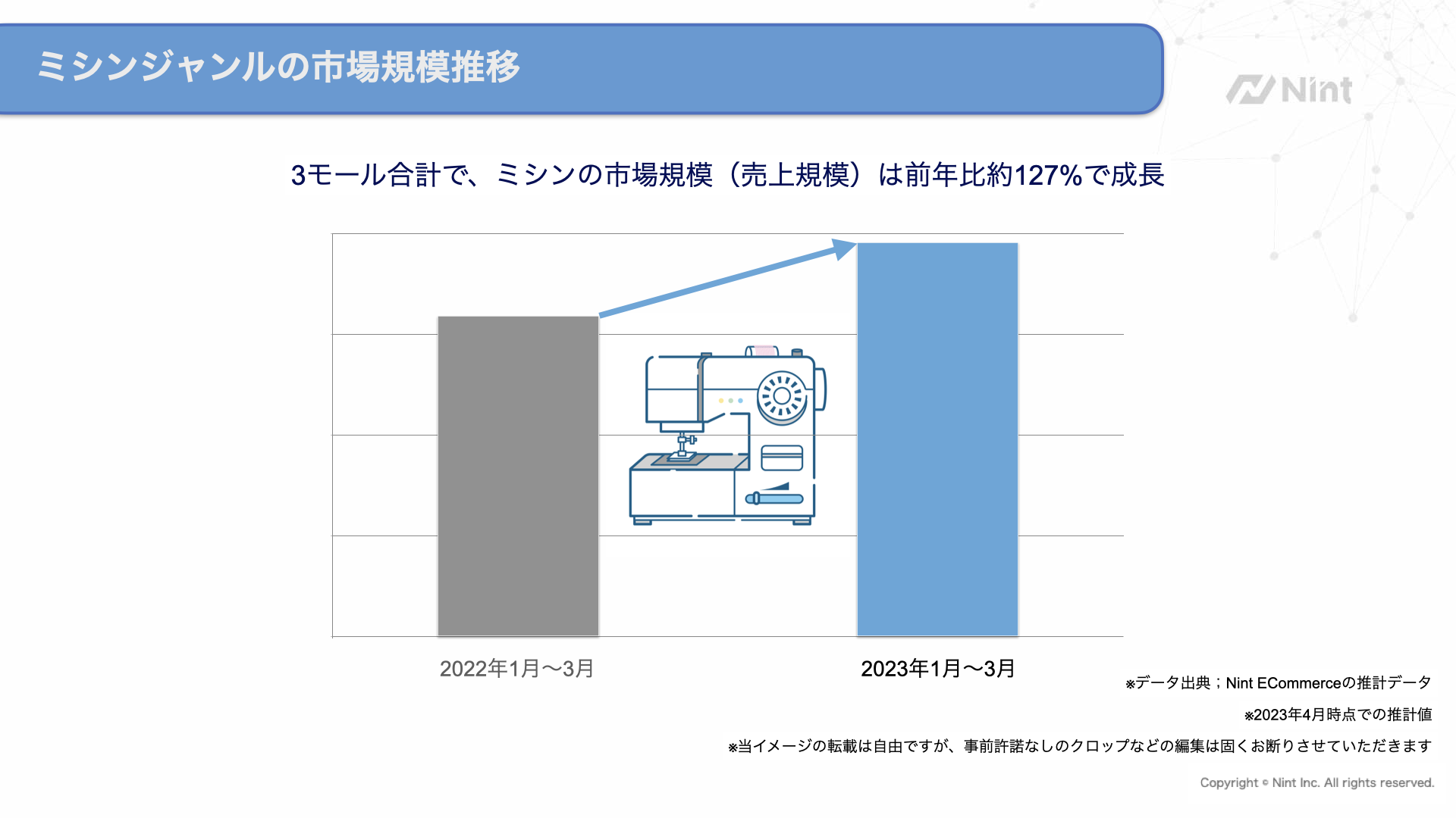 Amazon、楽天市場、Yahoo!ショッピングの3モールにおいて、2023年4月時点のNint推計データより、2023年1〜3月のミシンジャンルは高単価商品への買い替えニーズの追い風を受けて拡大トレンドとなっております。