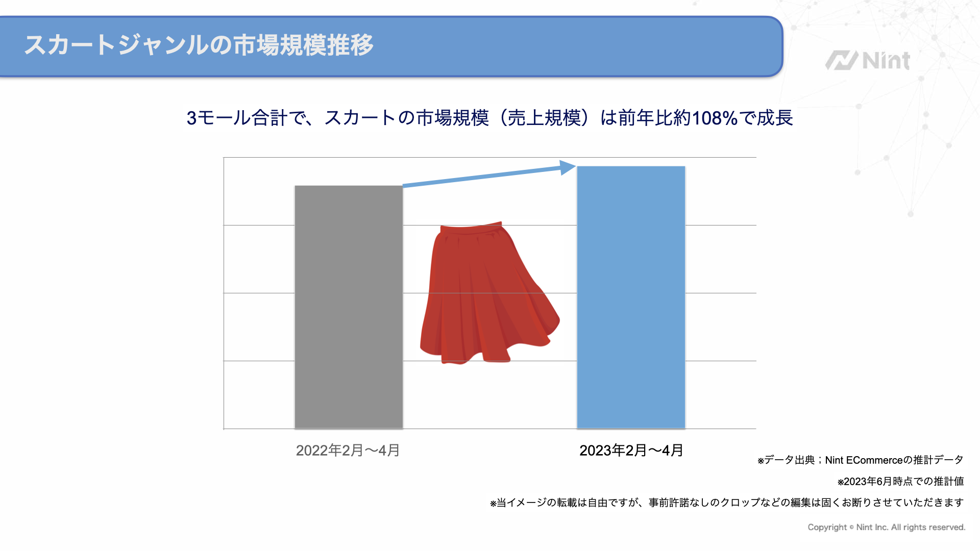 Amazon、楽天市場、Yahoo!ショッピングの3モールにおいて、2023年6月時点のNint推計データより、2023年2〜4月のスカートジャンルは当該時期の市場規模は2022年2月〜2022年4月と比較して108%となり、市場が堅調に拡大しております。今後の売上規模は推計値を元にした当社のAI分析を踏まえると、3モールにおいて当該ジャンルは上昇傾向という結果となりました。