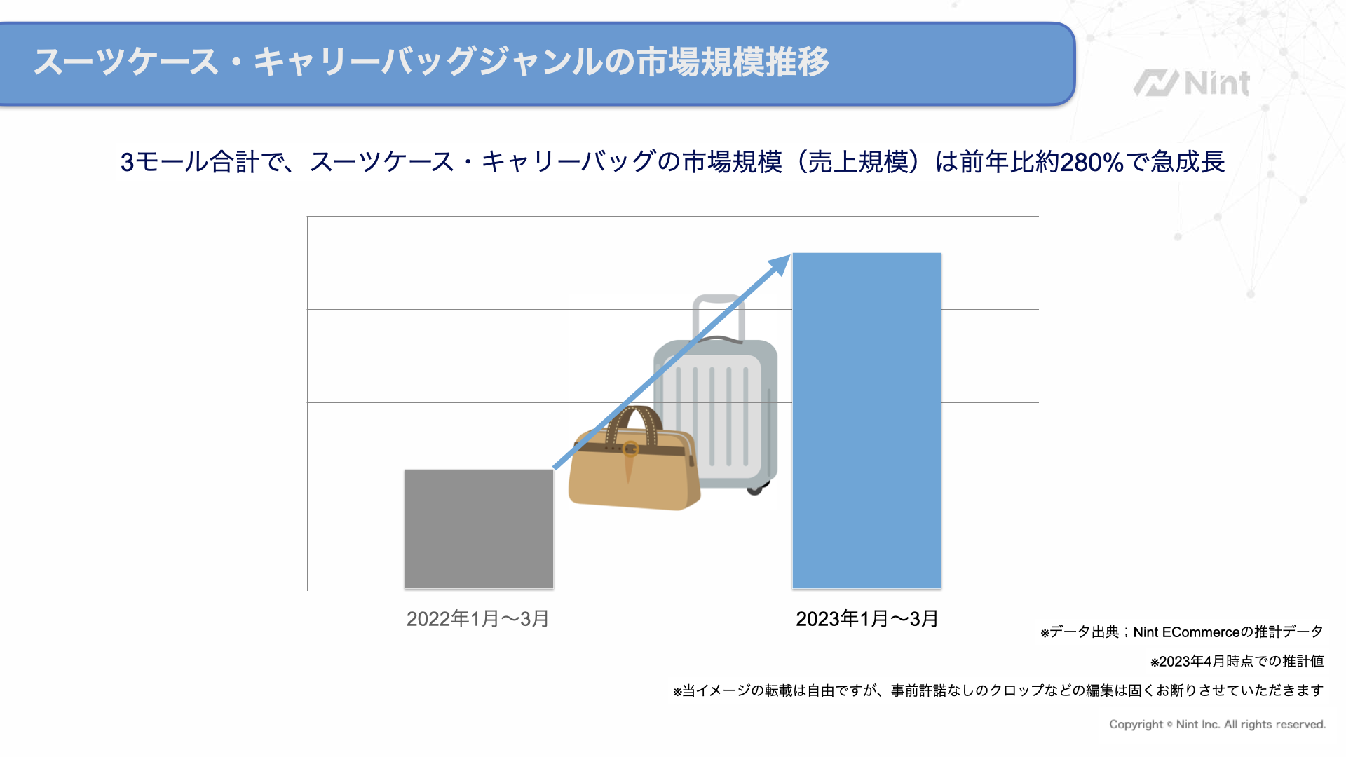 Amazon、楽天市場、Yahoo!ショッピングの3モールにおいて、2023年4月時点のNint推計データより、2023年1〜3月のスーツケース・キャリーバッグジャンルは新型コロナウイルス対策における規制緩和の追い風を受けて拡大トレンドが継続しています。当該時期の市場規模は2022年1〜3月と比較して280%となり、市場が急速に拡大しています。