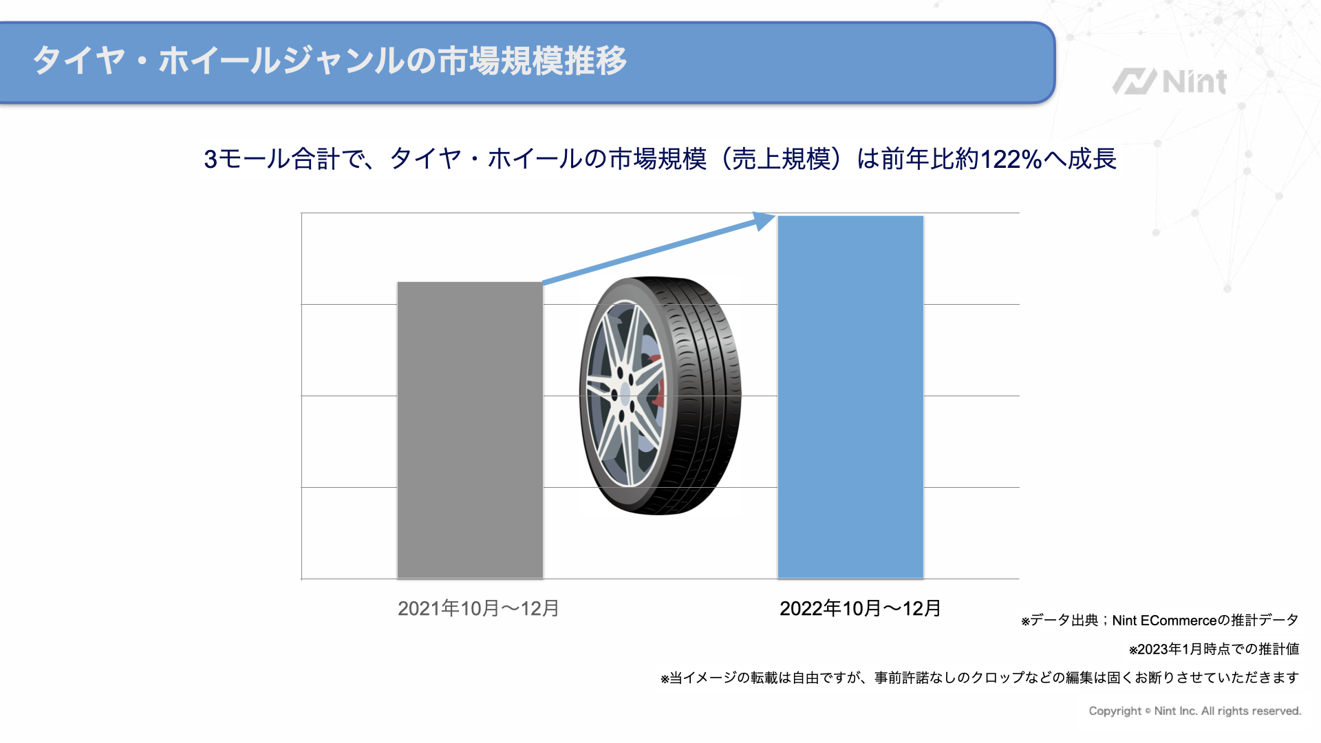 Amazon、楽天市場、Yahoo!ショッピングの3モールにおいて、Nint推計データ(2023年1月時点)より、2022年10月~12月のタイヤ・ホイールジャンルはコロナ禍以降、外出時に車を使用する需要の追い風を受けて拡大しております。