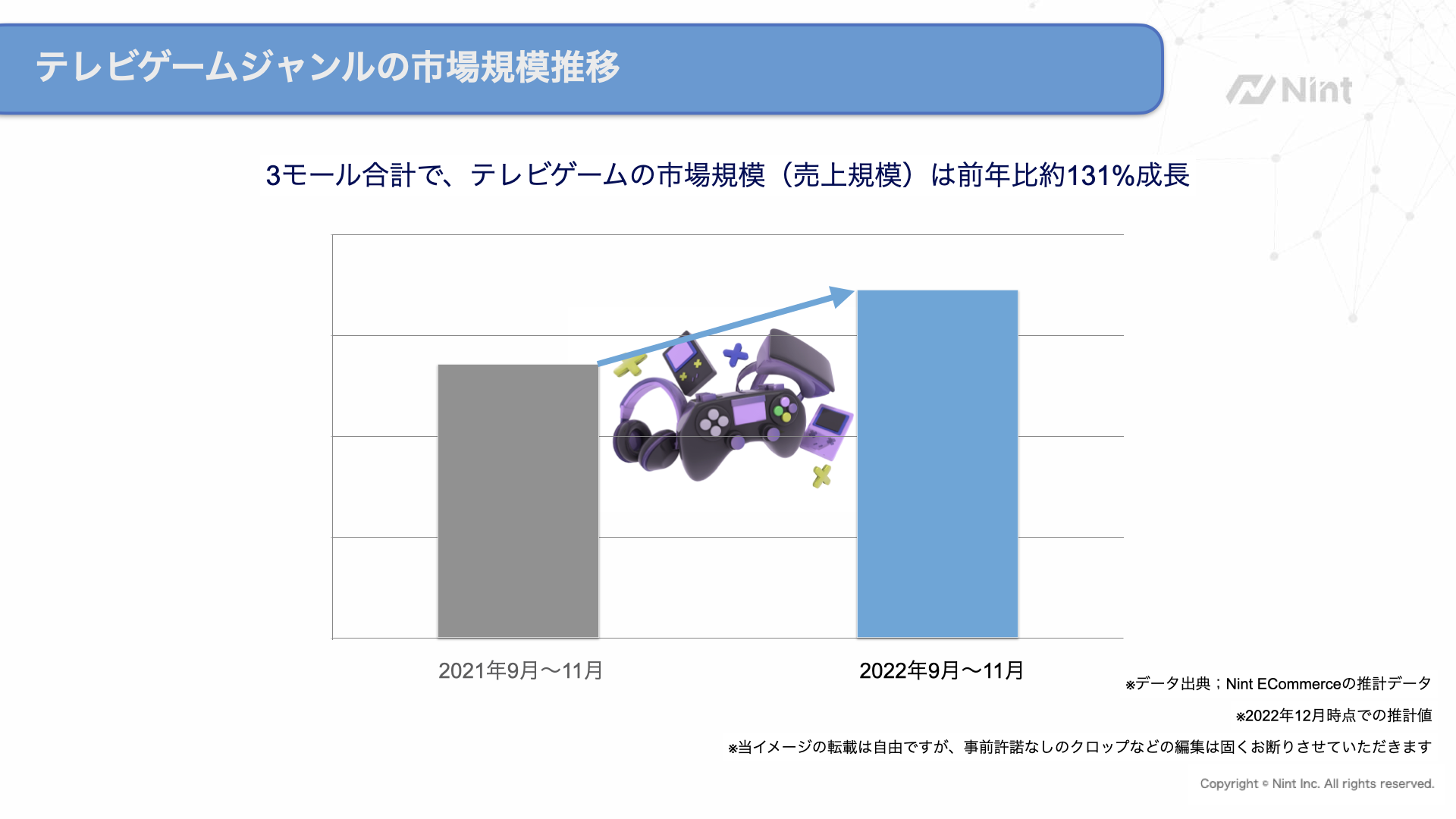 Amazon、楽天市場、Yahoo!ショッピングの3モールにおいて、Nint推計データ(2022年12月時点)より、2022年9月~11月のテレビゲームジャンルは人気ゲームソフトの新作が続いた追い風をうけ、市場が急速に拡大しております。