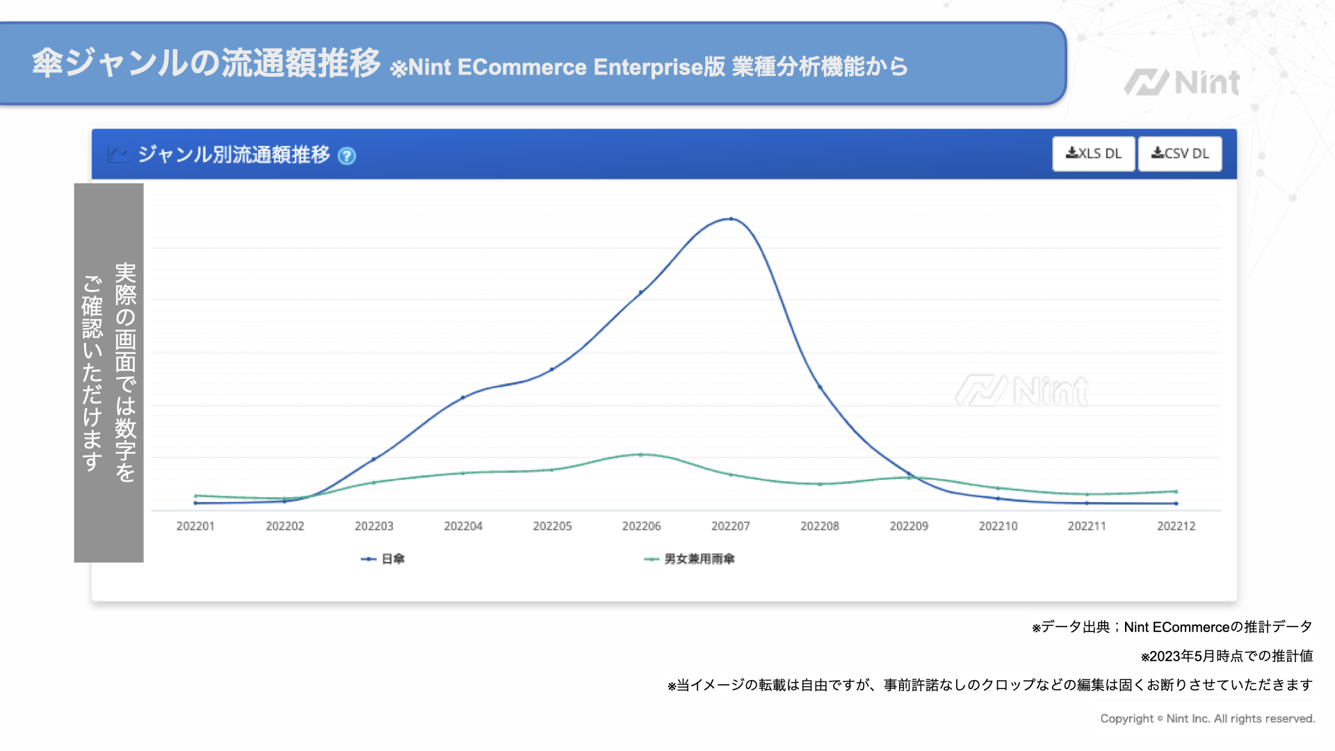 2023年はより人の移動が活発化し、気温も例年並みかそれ以上とのことなので、今年も昨年同様に7月にかけてヤマが出来ていくのではないかと考えております。また、2023年度の市場規模は、当社のAI分析を踏まえると、高止まりとの予想結果も出ております。今後EC市場での需要がピークを迎えるにあたり、目が離せないジャンルとなっております。