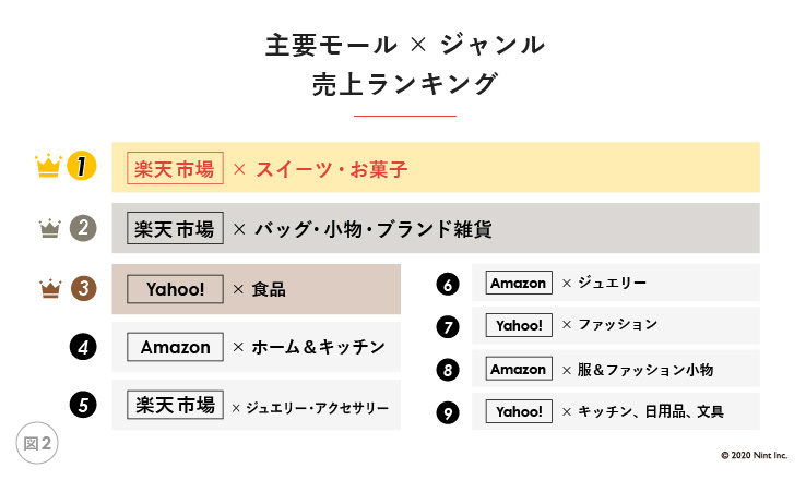まずは、主要3モールで、どのジャンルが売上を占めているのか、確認していきましょう。