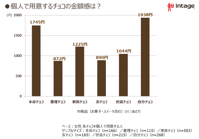 特に1,000円の予算を超えるのは「本命チョコ」「家族チョコ」「自分チョコ」「世話チョコ」となっています。