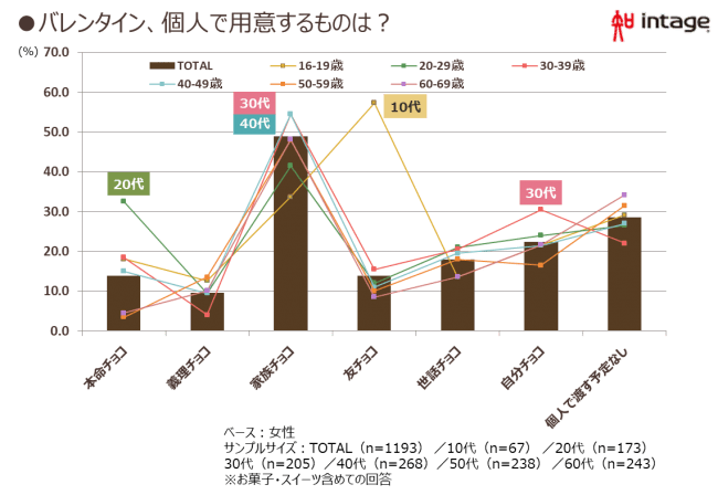 10代は「友チョコ」、20代は「本命」、30台は「家族」と「自分」に、40代も圧倒的に「家族」へのプレゼントを意識しているようです。