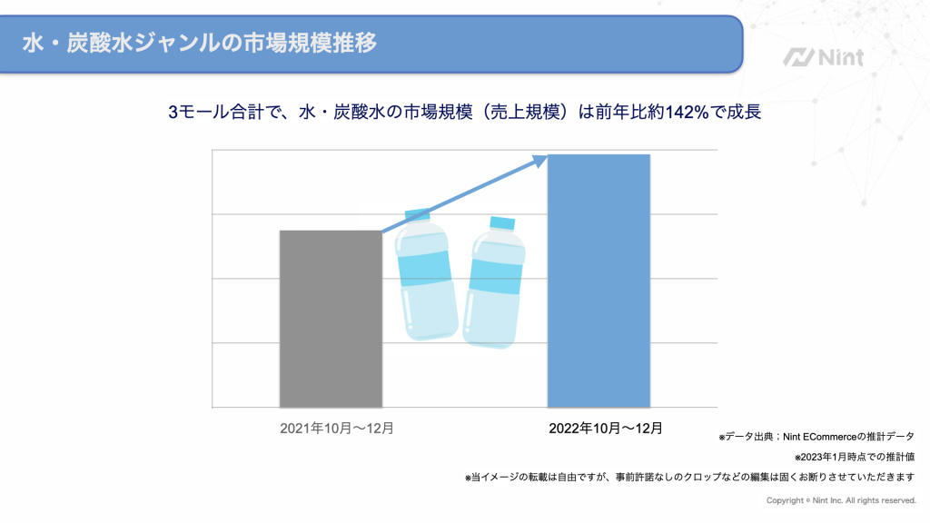 Amazon、楽天市場、Yahoo!ショッピングの3モールにおいて、Nint推計データ(2023年1月時点)より、2022年10月~12月の水・炭酸水ジャンルはラベルレスボトル需要の追い風を受けて拡大トレンドが継続しています。当該時期の市場規模は2021年10〜12月と比較して142%となり、市場が急速に拡大しています。