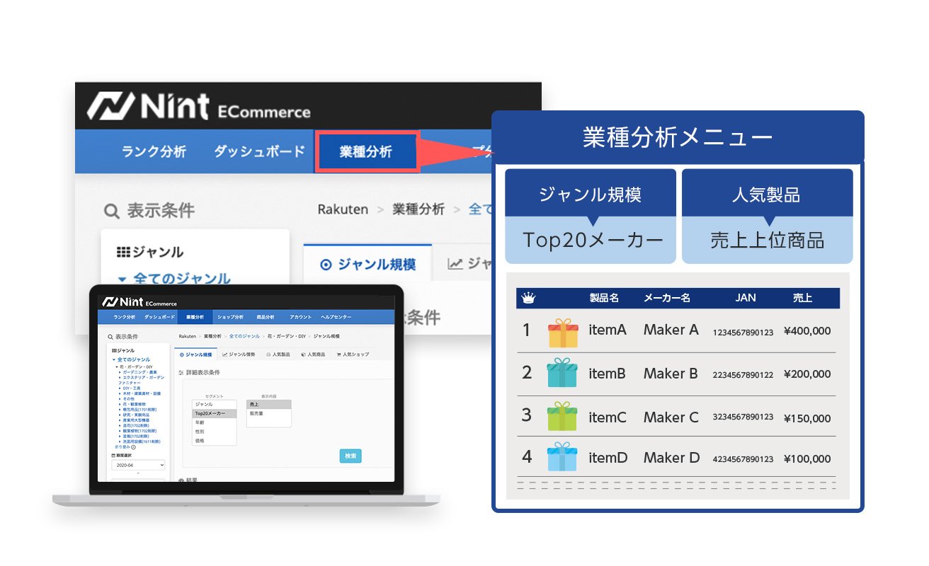 ※「業種分析」の「ジャンル規模」ジャンル・メーカー別の売上が確認できます。