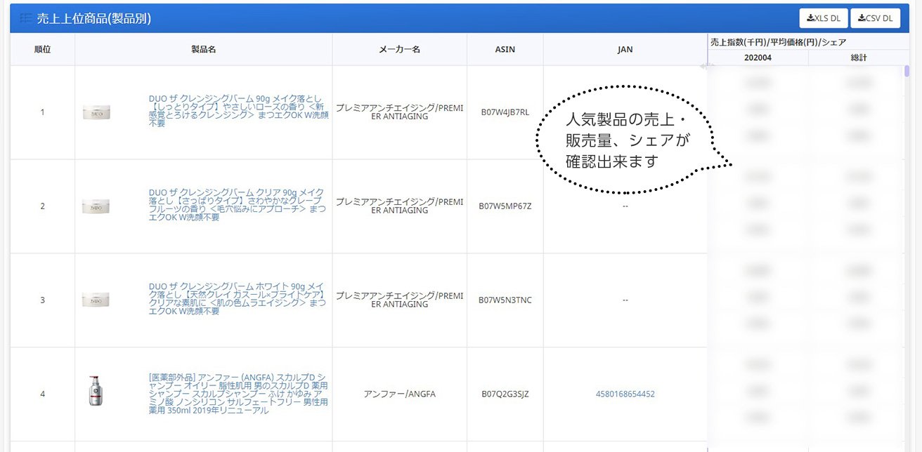 ※「業種分析の」「人気製品」で売上・販売量、シェアが確認出来ます。