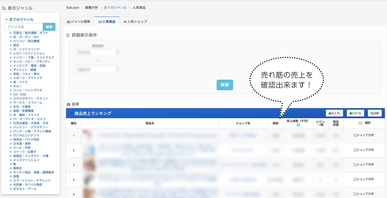※「業種分析」の人気商品で月度別の商品売上、価格、レビュー数を分析出来ます。