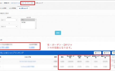 業種分析各階層で表示されているショップの売上指数は、指定したジャンルの売上指数の合計額となります。対象ショップのモール全体の売上指数ではありません。