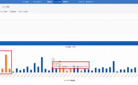 ショップ分析モール主催で開催されているイベント・キャンペーンがオレンジ色で表示されています。 ※楽天のみ オレンジ色の棒グラフにマウスオーバーすると、キャンペーン内容を確認する事ができます。