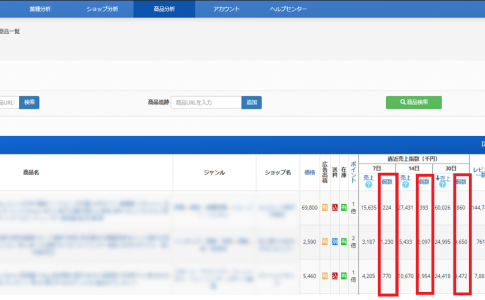 商品分析下記2つの機能から確認できます。 1.[商品分析]> [商品一覧]・[商品全閲覧]内 2.[ショップ分析]> [商品一覧]内