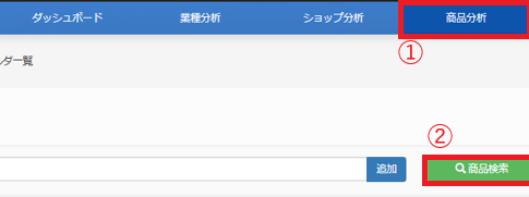 商品分析[商品分析]では、URLを入力することで追跡したい商品の登録が可能です。 商品URLの追加は、下記の手順で可能です。 ①「商品分析」をクリック ② にボタンをクリック、「商品分析」内のフォルダー...