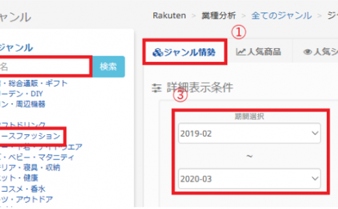 基本操作ここでは、基本的な機能の操作手順についてご説明いたします。 ・Enterprise版・Professional版どちらかわからない方はこちら 1.[ジャンル情勢] 2.[人気商品] 3.[人気ショップ] 1. [ジャンル...