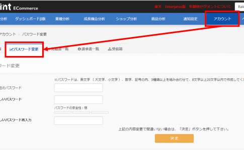 パスワードは、「アカウント」→「パスワード変更」から変更が可能です。