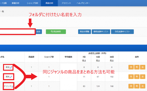 [商品分析]では、フォルダごとに追跡商品を振り分けることができます。 フォルダを活用することで、任意の条件での市場トレンドの把握や比較を行うことが可能になります。 フォルダ作成・...