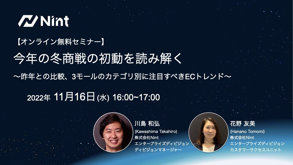 この度、Nint主催にて「今年の冬商戦の初動を読み解く ~昨年との比較、3モールのカテゴリ別に注目すべきECトレンド~ 」と題したセミナーを開催いたします。