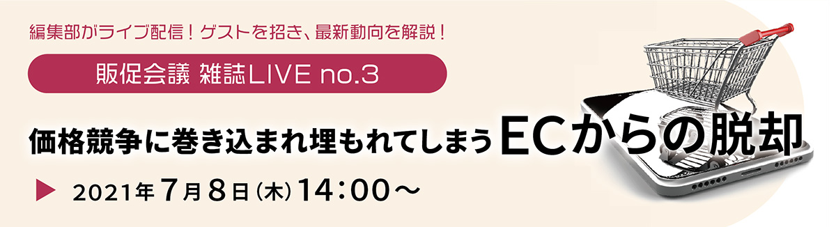 7月8日(木)14時から 月刊『販促会議』Live配信で 「価格競争に巻き込まれ埋もれてしまうECからの脱却」をテーマに登壇します。 視聴は、以下「詳細はこちらボタンをクリックして下さい。