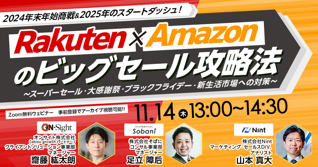 この度、2024年11月14日(木)に株式会社インターファクトリーとの共催セミナーを開催いたします。楽天・Amazonで年末年始商戦を成功させる「売上最大化のラストスパート戦略」を最新のデータに基づき徹底解説しますので、年末商戦で成果を上げたいEC事業者の皆様、ぜひご参加ください。
