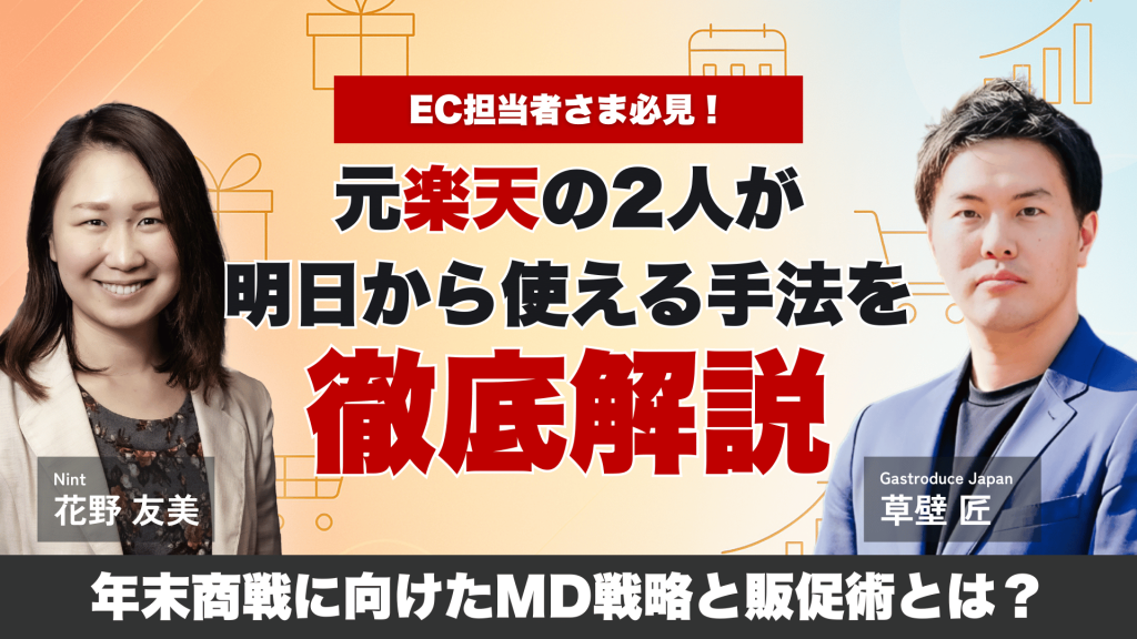 本配信は、2025年8月21日に開催して大変ご好評いただいたセミナーの録画配信となり、食品EC事業者向けの豊富な支援実績を持つGastroduce Japan 草壁匠氏と、株式会社Nint エンタープライズカスタマーサクセスユニット ユニットリーダー 花野友美が登壇しております。