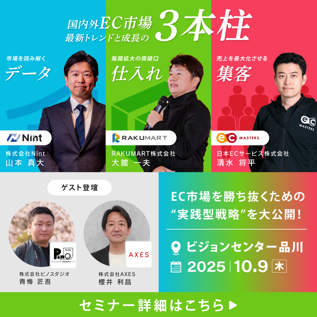 本セミナーでは、データ活用・仕入れ・集客の3つのテーマを軸に、モール型ECや越境ECで成果を上げるためのリアルな実践ノウハウを解説します。
