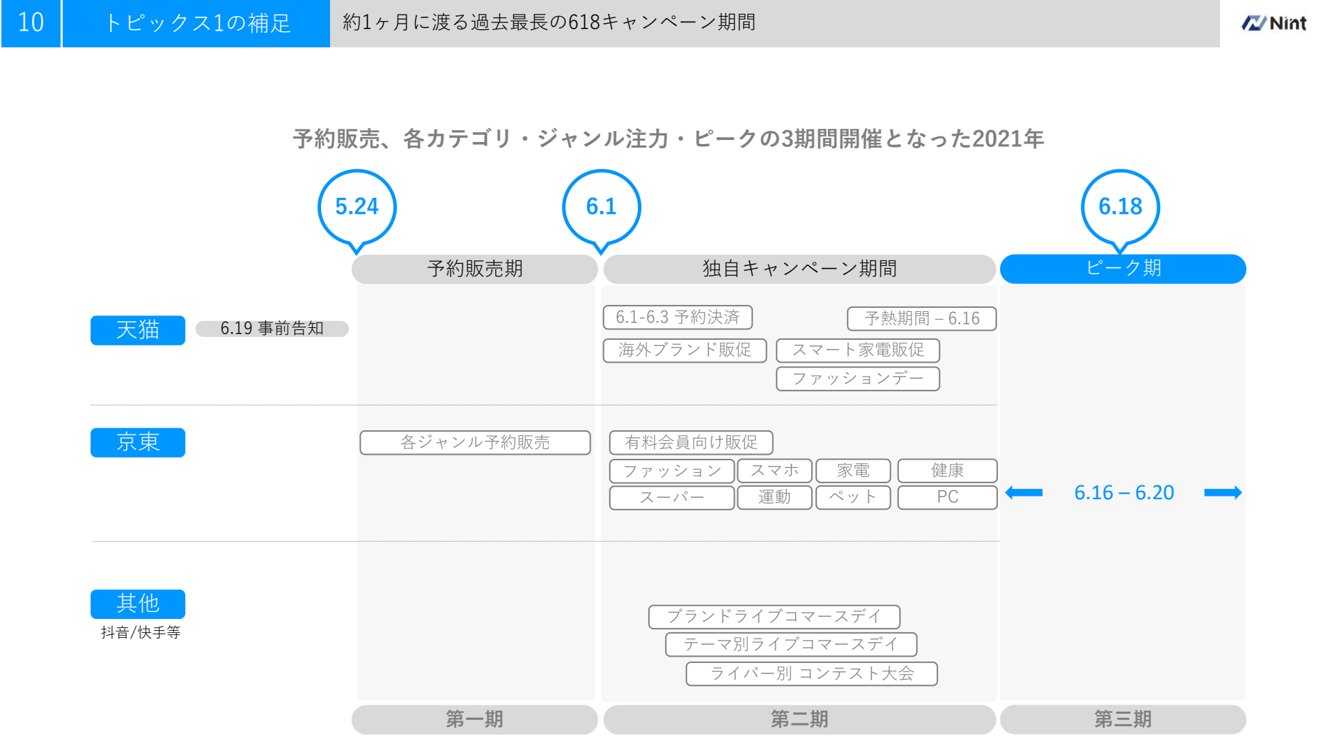 アフターコロナとなっている中国ですが、本セミナー動画では、中国ECの大型セールイベントである「618」商戦の全体的な売上と前年からどれだけ伸長しているか、また、新たな消費トレンドとなりつつある「新国貨」の影響がどの程度あったのかなど、セールの結果を含め、今後の中国ECのトレンドを解説していきます。『618』商戦全体レポート動画が1本、各カテゴリに特化した動画が6本、計7本の動画をご用意しております。