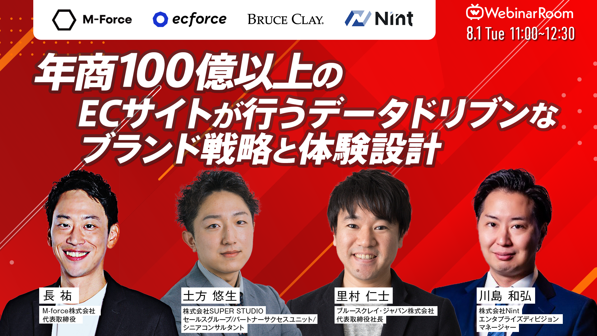 2023年8月1日に株式会社NintとM-Force株式会社、株式会社SUPER STUDIO、ブルースクレイ・ジャパン株式会社の4社で共催した無料セミナー「年商100億円以上のECサイトが行うデータドリブンなブランド戦略と体験設計」には大変多くの方にご参加いただき、盛況に終えることができました。