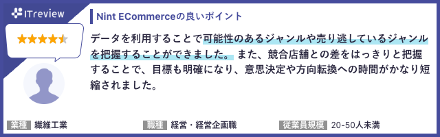 頂きましたレビュー内では商品開発から、販売商品の選定、販売施策など様々なシーンの中で合理的な判断を頂くにあたり欠かせないツールとして「Nint ECommerce」をご活用頂いているなどご意見を多数頂戴いたしました。