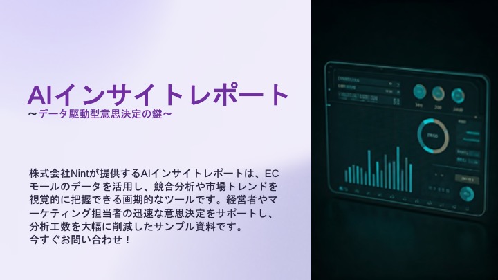 2024年9月30日、「データの価値、人の可能性が輝く世界」をビジョンに、国内大手ECモールの市場動向データ分析ツールを提供する株式会社Nint(本社:東京都新宿区、代表取締役:吉野順子、以下「Nint」)は、10年間にわたり培ってきた技術力を基に、新しいAIインサイトレポートサービスの提供を開始いたしましたことをお知らせいたします。