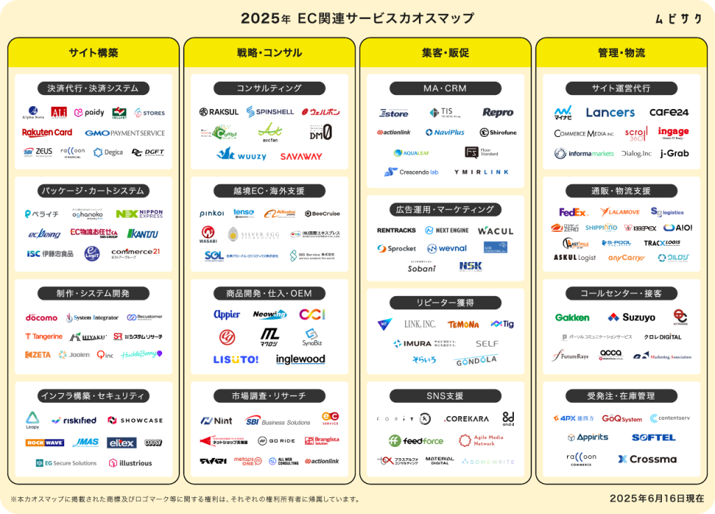 こうした背景のもと、今回のカオスマップは、これからECを始める企業様はもちろん、既存のEC事業をさらに拡大したい企業様にとって、最適なパートナー選定の参考になる内容となっています。