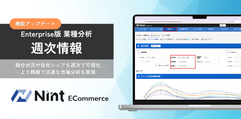 株式会社Nint(本社:東京都新宿区、代表取締役:吉野順子、以下「Nint」)は、ECデータ分析サービス「Nint ECommerce」のEnterprise版において、新機能「Enterprise版業種分析:週次情報」を提供開始いたしました。本機能により、競合状況や自社シェアの変動を週単位で把握できるようになり、施策の即応性・精度の向上を支援します。