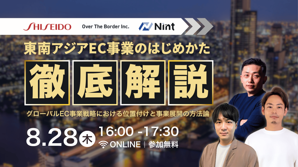 株式会社Nint(本社:東京都新宿区、代表取締役:吉野順子 以下、「Nint」)は、東南アジアEC市場をテーマに、資生堂ジャパン株式会社、株式会社Over the Borderと共催で、無料オンラインセミナー「東南アジアEC市場参入率が3年で2倍に!東南アジアEC事業のはじめかた」を2025年8月28日(木)に開催いたします。本セミナーでは、各社による講演に加え、ブランド・支援・データの3つの視点から市場を読み解くパネルディスカッションも実施予定です。