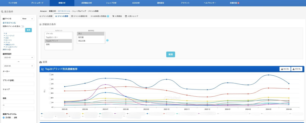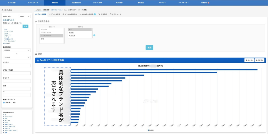 実際の画面①。検索画面において詳細表示条件に「TOP20ブランド」を指定し、表示単位を「売上」とすることで、主要ブランド別の売上規模が表示されます。主要ブランドのシェア状況を確認可能です。
